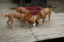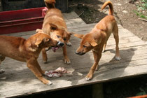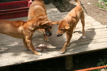 Nach kurzer "Diskussion" beanspruchte der Rüde Duggy, das Fleisch für sich. Der sich rechts aus dem Bild bewegende Hund ist der Papa, Christian.