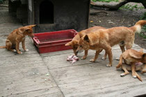 Duggy ist kurz aufgestanden und hat von seinem Fleischstück abgelassen. Sofort ist Christian zur Stelle und beansprucht das Futter für sich. Duggy, versucht nochmal seine Beute zu verteidigen.
