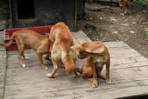 Christian legt sich zu Duggy und paßt auf. Die Schwestern sind die einzigen, die sich nähern dürfen. Andere erwachsene Hunde werden von Christian vertrieben.